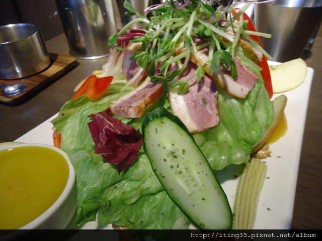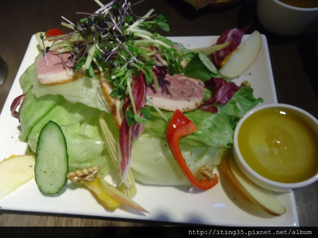 好友點的櫻桃鴨胸沙拉+100元有小餐包、湯、咖啡或茶