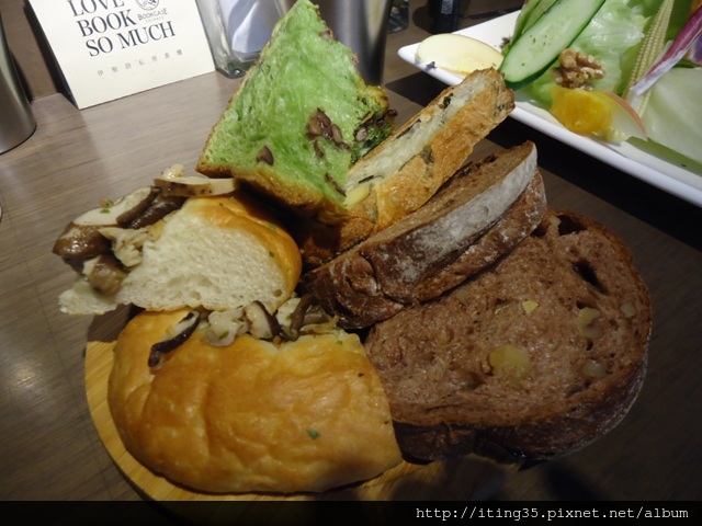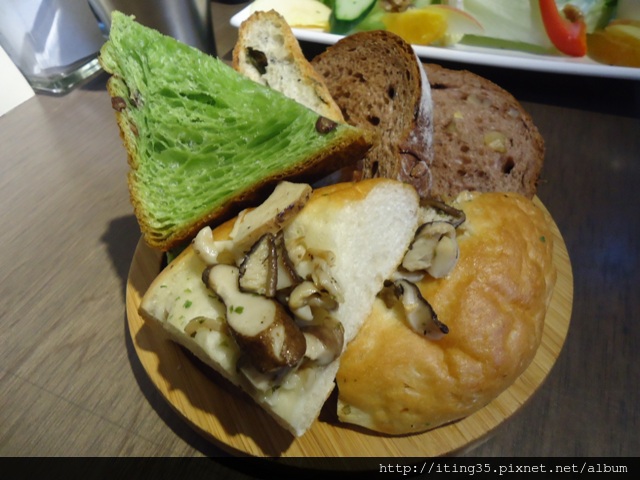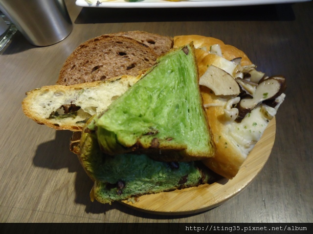 麵包盤共四種有抹茶紅豆、香菇鹹麵包、巧克力、九層塔麵包,每天依當日麵包種類變換