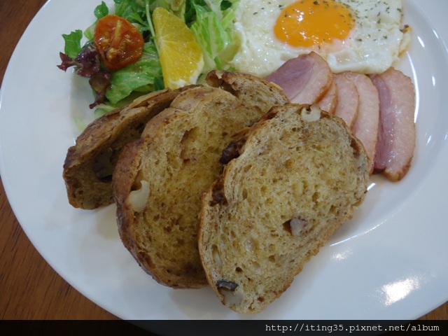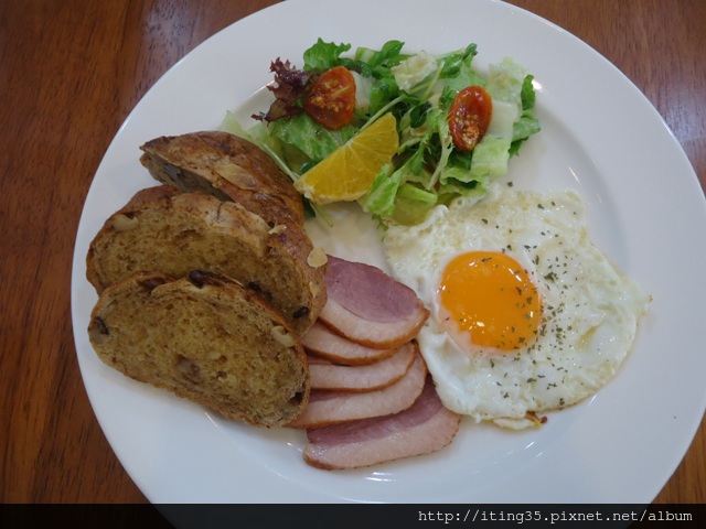 有櫻桃鴨胸、荷包蛋、核桃麵包、蔬果沙拉