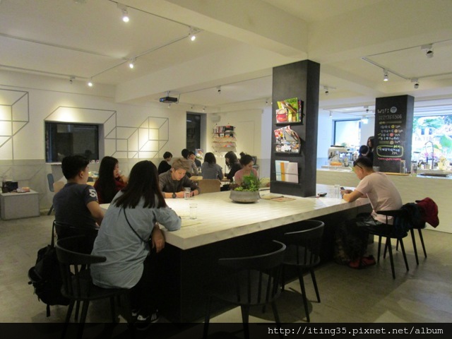 白色磁磚打造多人的共桌,原本想坐這張長桌,但人太多這裡空間顯得很吵雜