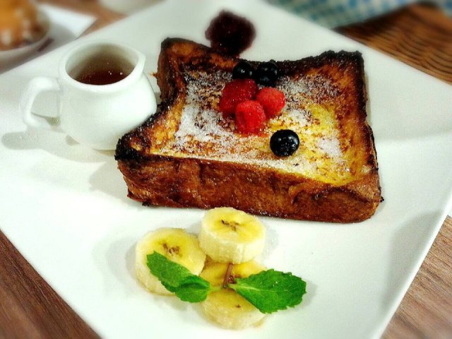 與小慢剛好在內湖,順到來嚐嚐招牌甜點法式吐司,一上桌有點楞住,怎麼是焦黑的,跟服務生反應了,回說烤出來就是這樣,有看過FB官網的照片不是如此呈現的,如果說這是好多顆星星的麵包,在餐點的部份還需要再加強吧~~