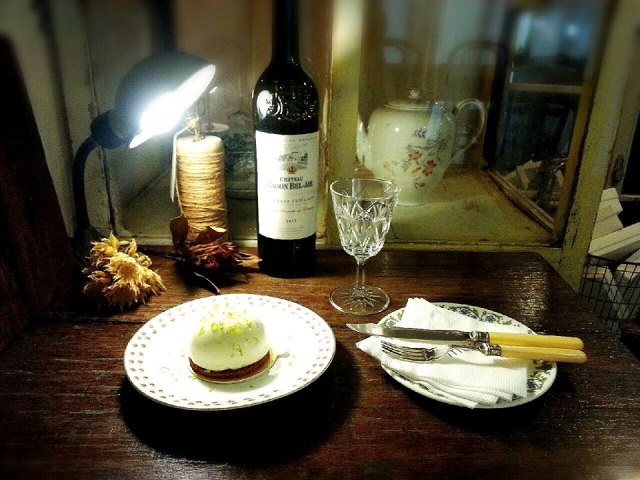 用古董盤盛裝,外層是雪白的椰奶慕斯與檸檬絲,內層是鳳梨丁,底層是達克瓦茲,吃的時候要由上而下一起品嚐,多層次的豐富口感,非常清爽,很適合夏天的甜品。