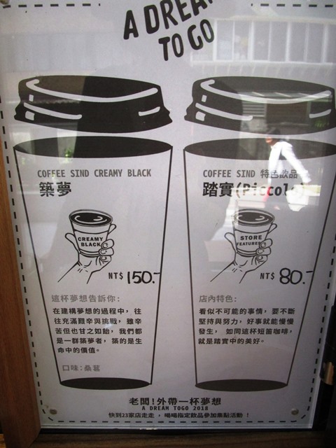 安靜的巷弄內過往的人很少,可以隨意坐或站輕啜咖啡香,開放式的咖啡吧熱夏暫無冷氣提供,所以正午後可能過熱,怕熱就來杯清涼品解熱吧! Coffee Sind也有參與7月開跑的「老闆!外帶一杯夢想」活動,提供夢想(冷飲)與踏實(熱飲)兩種咖啡供選擇,雖然知道這個活動,但看了23家店所提供的咖啡品項都以特調冷飲為主,對於習慣喝熱飲及純咖啡的我不太有吸引力,點了一杯「短笛」來呼應此活動,也是我的第一家集點,活動持續到9月底,有興趣的朋友可以到官網詳閱。